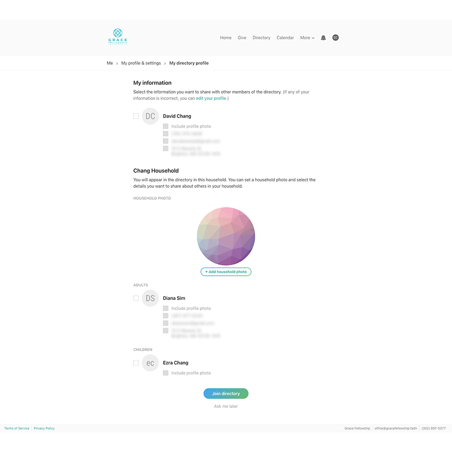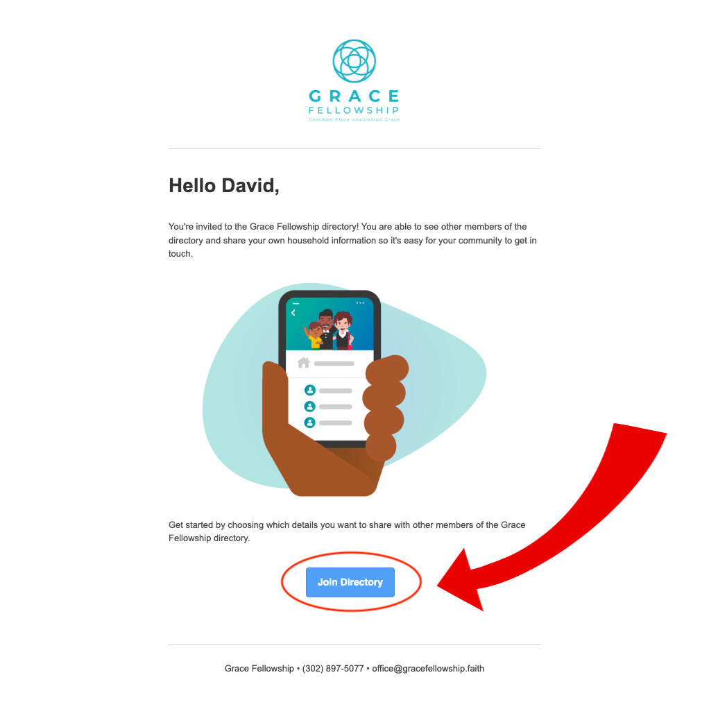 Locate your invitation email (sent from no-reply@planningcenteronline.com) and click the "Join Directory" link.